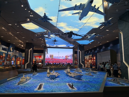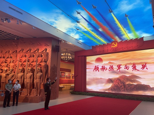 圖為“領(lǐng)航強軍向復(fù)興——新時代國防和軍隊建設(shè)成就展”展廳。