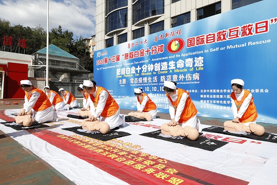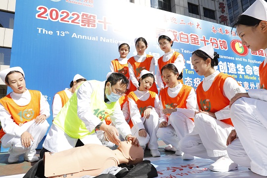 有研究顯示:我國每年猝死發(fā)生數(shù)量已經(jīng)由10多年前的54.5萬增加到100萬人左右,其中65%發(fā)生在頭10分鐘左右的時間內(nèi),常常發(fā)生在家中、工作崗位、公共交通或活動等場所,我國每年因創(chuàng)傷就醫(yī)人數(shù)達6200萬人次,致死70萬人,其中25%約17.5萬人是在10分鐘內(nèi)死于現(xiàn)場。為了滿足軍地急救需要,何忠杰主任醫(yī)師團隊于2010年10月10日10時,發(fā)起“白金十分鐘全國自救互救志愿服務(wù)聯(lián)盟”,開展“急救白金十分鐘·全國自救互救日”公益活動?;顒右唤?jīng)推出,醫(yī)療同行和廣大軍民群眾踴躍參加,“科普技術(shù)+白金十分鐘MV+廣場舞大賽”的“自救互救日”文化悄然興起,在補齊了應(yīng)急急救鏈的同時挽救了更多人的生命。