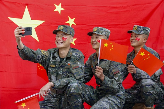 圖為官兵與國(guó)旗合影。李豪 攝
