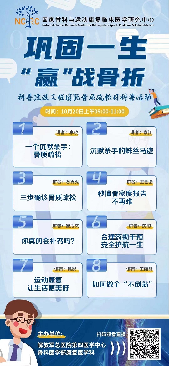 本報(bào)訊 見習(xí)記者韓瀟 通訊員李曉 石秀秀 10月20日,是世界衛(wèi)生組織確立的“國際骨質(zhì)疏松日”,今年中國的主題是“鞏固一生,贏戰(zhàn)骨折”。解放軍總醫(yī)院第四醫(yī)學(xué)中心骨科醫(yī)學(xué)部康復(fù)醫(yī)學(xué)科充分利用國家骨科與運(yùn)動康復(fù)臨床醫(yī)學(xué)研究中心平臺,即骨科與運(yùn)動康復(fù)領(lǐng)域唯一的國家級臨床醫(yī)學(xué)研究中心,在“科普建設(shè)工程”版塊開展線上科普宣傳活動。活動中,共有1萬余名患者及家屬登陸直播間觀看。這是該醫(yī)學(xué)部貫徹落實(shí)“健康中國2030發(fā)展綱要”的實(shí)際行動,目的是關(guān)注全國軍民各個(gè)年齡段骨骼健康,引導(dǎo)遠(yuǎn)離骨質(zhì)疏松危害,降低發(fā)生脆性骨折的風(fēng)險(xiǎn),提高健康生活質(zhì)量。