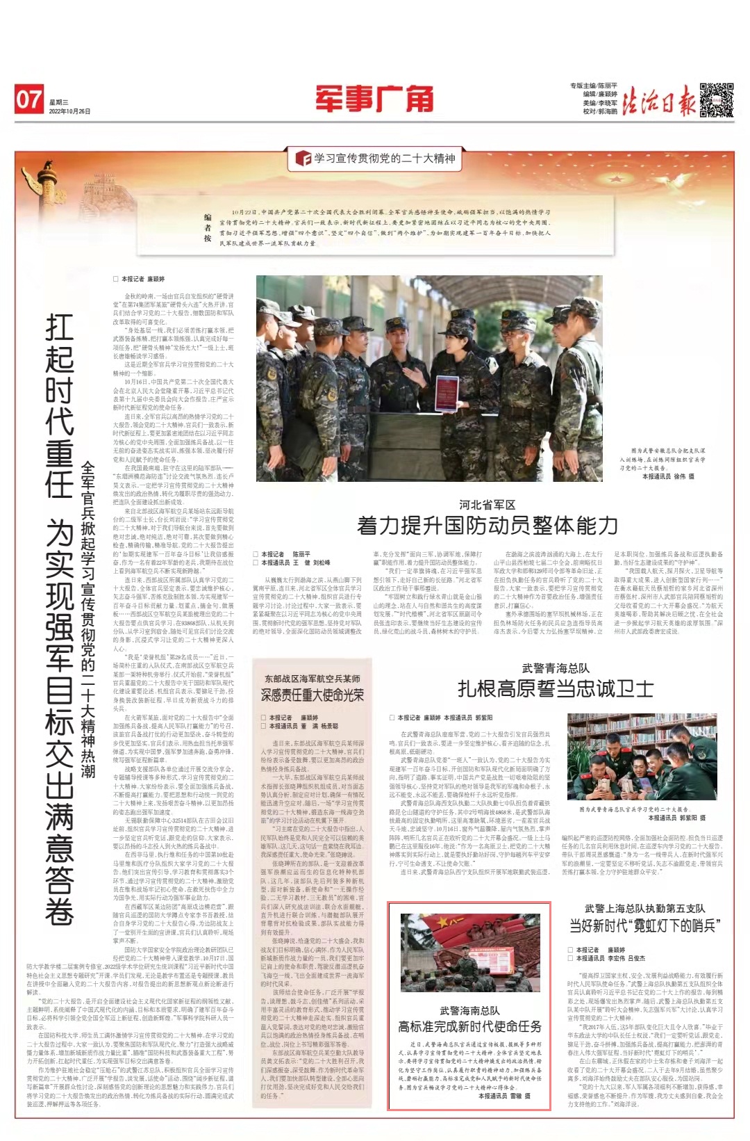 近日,武警海南總隊(duì)官兵通過(guò)宣傳板報(bào)、報(bào)紙等多種形式,認(rèn)真學(xué)習(xí)宣傳貫徹黨的二十大精神。全體官兵堅(jiān)定地表示,要將學(xué)習(xí)宣傳貫徹黨的二十大精神煥發(fā)出的政治熱情,轉(zhuǎn)化為堅(jiān)守工作崗位、認(rèn)真履行職責(zé)的精神動(dòng)力,加強(qiáng)練兵備戰(zhàn)、磨礪打贏能力,高標(biāo)準(zhǔn)完成黨和人民賦予的新時(shí)代使命任務(wù)。