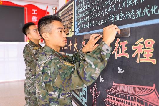 圖為官兵正在進(jìn)行“贊頌十年成就,奮進(jìn)新時代”板報創(chuàng)作。