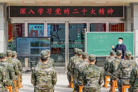 圖為東壩頭鄉(xiāng)張莊村第一書記余強(qiáng),到營區(qū)宣講黨的二十大精神。