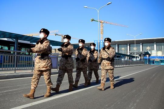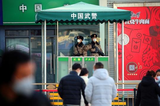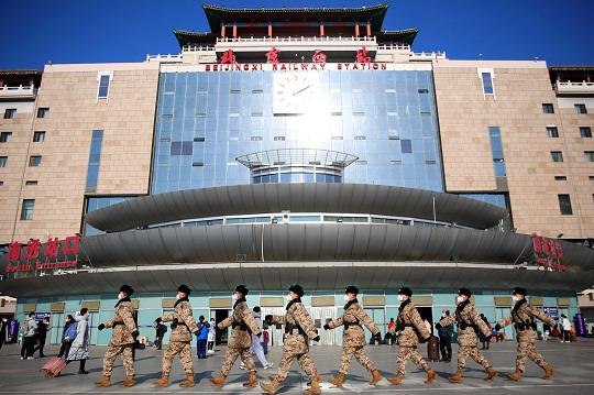 圖為北京豐臺(tái)站執(zhí)勤武警奔赴執(zhí)勤哨位。
