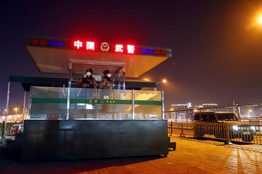 圖為華燈初上,武警官兵堅(jiān)守在執(zhí)勤哨位。