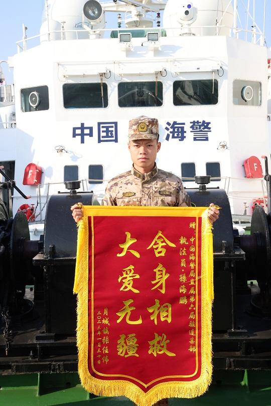 圖為中國海警局直屬第六局黃鷹艦執(zhí)法員接受錦旗。