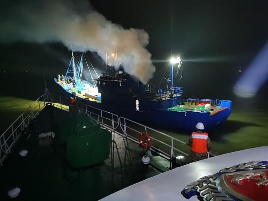 圖為滄州海警局執(zhí)法艦艇靠泊失去動力漁船。