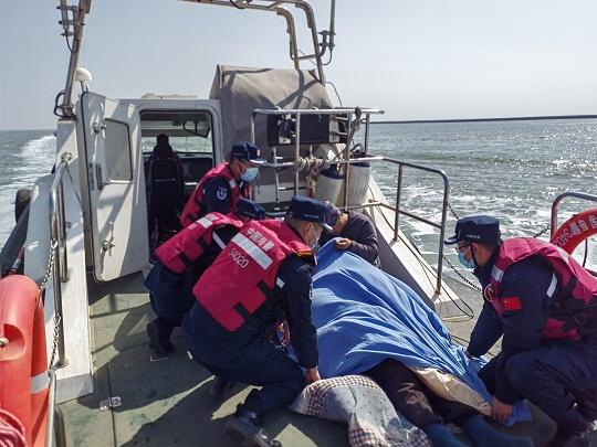 圖為東營海警局執(zhí)法員救助受傷漁民。