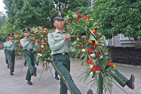 圖為李林雨(右二)參與“壬寅年世界華人炎帝故里尋根節(jié)”禮兵敬獻(xiàn)花籃任務(wù)集訓(xùn)。武警湖北總隊(duì)供圖