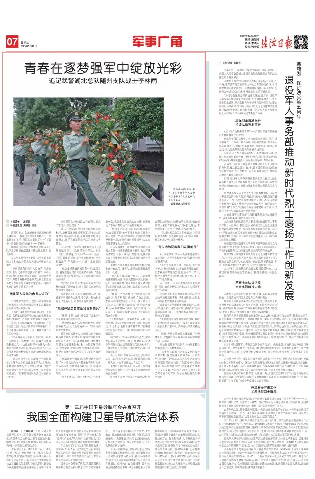 2022年7月12日,武警湖北總隊(duì)隨州支隊(duì)下士李林雨在巡邏途中勇救落水群眾,壯烈犧牲。