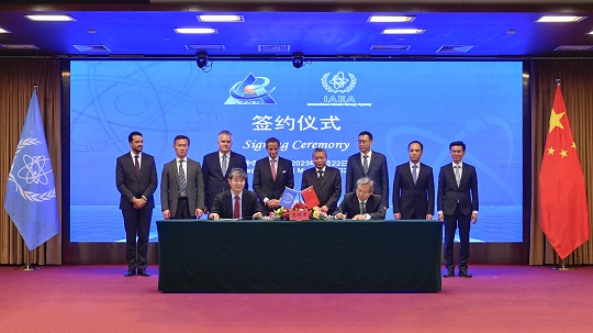會(huì)見(jiàn)前,張克儉與格羅西簽署了《中國(guó)國(guó)家原子能機(jī)構(gòu)與國(guó)際原子能機(jī)構(gòu)關(guān)于小型模塊化反應(yīng)堆和核電基礎(chǔ)設(shè)施開(kāi)發(fā)領(lǐng)域合作實(shí)際安排》,并共同見(jiàn)證國(guó)家原子能機(jī)構(gòu)、中核集團(tuán)、中國(guó)科學(xué)院合肥物質(zhì)科學(xué)研究院、中國(guó)原子能科學(xué)研究院等與IAEA簽署多項(xiàng)合作文件,內(nèi)容涉及核能應(yīng)對(duì)氣候變化、核技術(shù)診斷治療癌癥、核數(shù)據(jù)科學(xué)與核燃料循環(huán)、涉核新聞傳播與公眾溝通等多個(gè)領(lǐng)域。國(guó)家原子能機(jī)構(gòu)還向IAEA交付了一批由中方企業(yè)捐贈(zèng)的核安保專(zhuān)業(yè)設(shè)備,以及38項(xiàng)由中方翻譯完成的IAEA核安全標(biāo)準(zhǔn)和核安保導(dǎo)則。