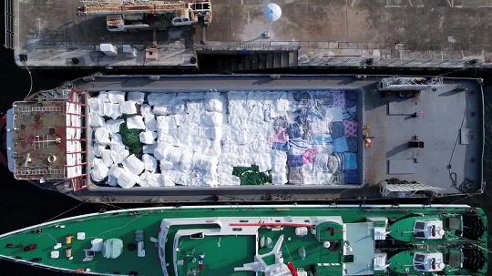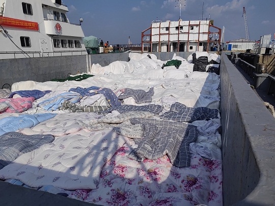 經(jīng)查,該嫌疑船為鐵質(zhì)運輸船,駕駛臺后方為貨艙,貨艙內(nèi)裝有白色和黑色塑料編織袋,袋內(nèi)有來源不明的牛肉、牛腩、牛肚、牛筋、驢雜等凍品約485噸,案值約4000萬元,隨船人員均未能提供船上所裝載貨物的相關(guān)合法來源證明,執(zhí)法員依法對該船舶和凍品進(jìn)行扣押。