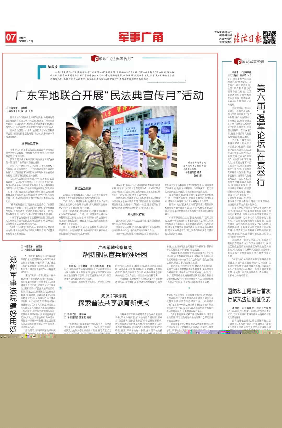“此次‘民法典宣傳月’活動,對駐粵部隊貫徹依法治軍、建設(shè)法治軍營起到很大的推動作用。”武警某部政治委員史旭斌說。
