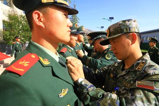 圖為武警青海總隊(duì)黨員干部為新黨員佩戴黨徽。李懿軒 攝