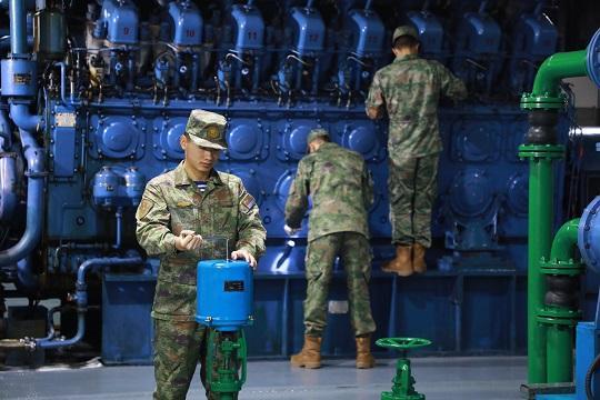 圖為海軍某通信部隊(duì)官兵對柴油機(jī)進(jìn)行檢修維護(hù)。