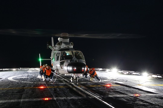 圖為當(dāng)?shù)貢r(shí)間7月26日晚上,編隊(duì)指揮艦淄博艦艦載直升機(jī)完成警戒巡邏后任務(wù)后進(jìn)行夜間著艦。張?jiān)?攝