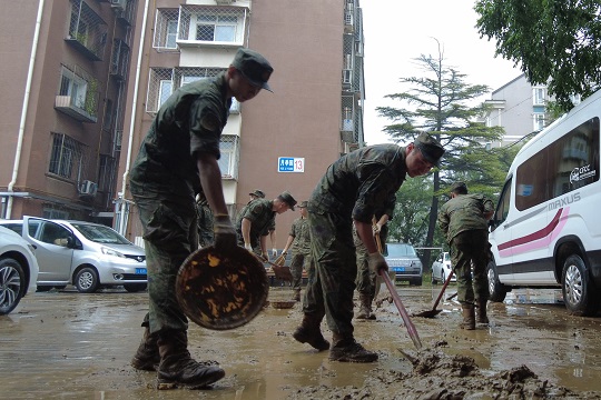 8月1日,北京市門頭溝區(qū)受連續(xù)暴雨和山洪影響,大量泥沙、草木堆積在河道兩側(cè)和市區(qū)道路,嚴(yán)重阻礙交通出行。中部戰(zhàn)區(qū)空軍某部組織官兵赴街道社區(qū),參與清除淤泥和垃圾20 余噸,積極配合駐地開(kāi)展應(yīng)急支援和災(zāi)后秩序恢復(fù)工作。