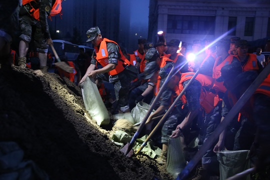 8月4日0時20分,武警黑龍江總隊哈爾濱支隊200余名官兵緊急馳援,連夜奮戰(zhàn)9小時,在螞蟻河周邊壘筑沙袋2.8萬余個,筑起1.3米高阻隔沙墻600余延長米,保證了當(dāng)?shù)厝嗣袢罕娚敭a(chǎn)安全。