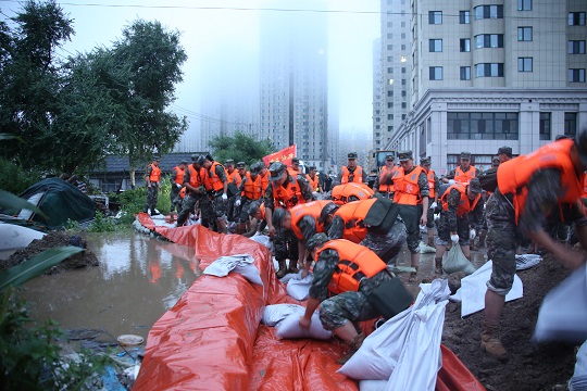 8月4日10時,全體參戰(zhàn)官兵轉(zhuǎn)戰(zhàn)螞蟻河西側(cè)綏滿公路一線,進(jìn)行1000余米的加固堤壩任務(wù),防止河水漫堤,倒灌進(jìn)市區(qū)造成進(jìn)一步城市內(nèi)澇的發(fā)生。