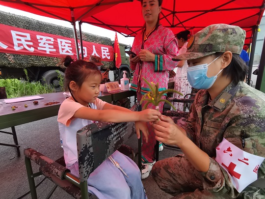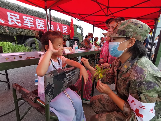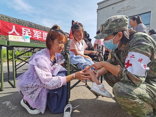 “寶貝兒放心,阿姨一定仔細給你瞧瞧,對癥用藥之后,就不會又癢又疼了?!贬t(yī)療隊員孟博從診斷席上走出來,將小女孩兒抱上軍用折疊椅,輕輕地擼起小女孩兒的褲腿,發(fā)現(xiàn)小腿局部皮膚會出現(xiàn)紅腫、水皰,且有明顯瘙癢等癥狀,初步診斷為被毒蚊叮咬浸水感染。隨即對其創(chuàng)面清潔、消毒、涂藥,之后又給她贈送了止癢、消腫、消炎等藥品,并向她媽媽交代了注意事項。