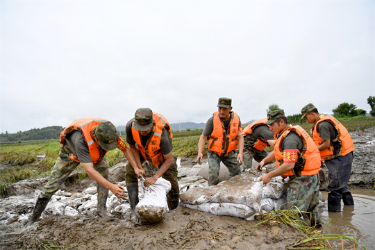 圖為北部戰(zhàn)區(qū)陸軍某旅成立黨員突擊隊(duì),在吉林省扶余市弓棚子鎮(zhèn)拉林河楊家崴子段封堵決口。王馳 攝