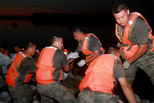 圖為北部戰(zhàn)區(qū)陸軍某旅成立黨員突擊隊(duì),在吉林省扶余市弓棚子鎮(zhèn)拉林河楊家崴子段封堵決口。李朝陽 攝