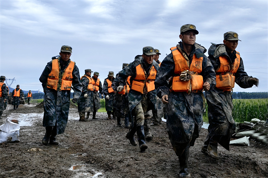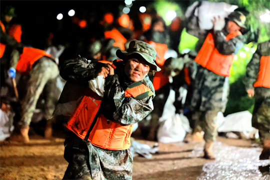 在某合成旅,眼看著水位越漲越高、水流越來越急、塌方越來越大,從旅長(zhǎng)到列兵,大家冒雨喊著“人在堤在”口號(hào),一刻不停地鏟沙土、裝沙袋、堆沙墻。列兵鐘習(xí)文患有精索靜脈曲張,因長(zhǎng)時(shí)間泡在水里導(dǎo)致墜脹和疼痛讓他直冒冷汗。身上痛手上活卻沒停,他一次又一次背著沙袋,一路小跑沖向河堤。