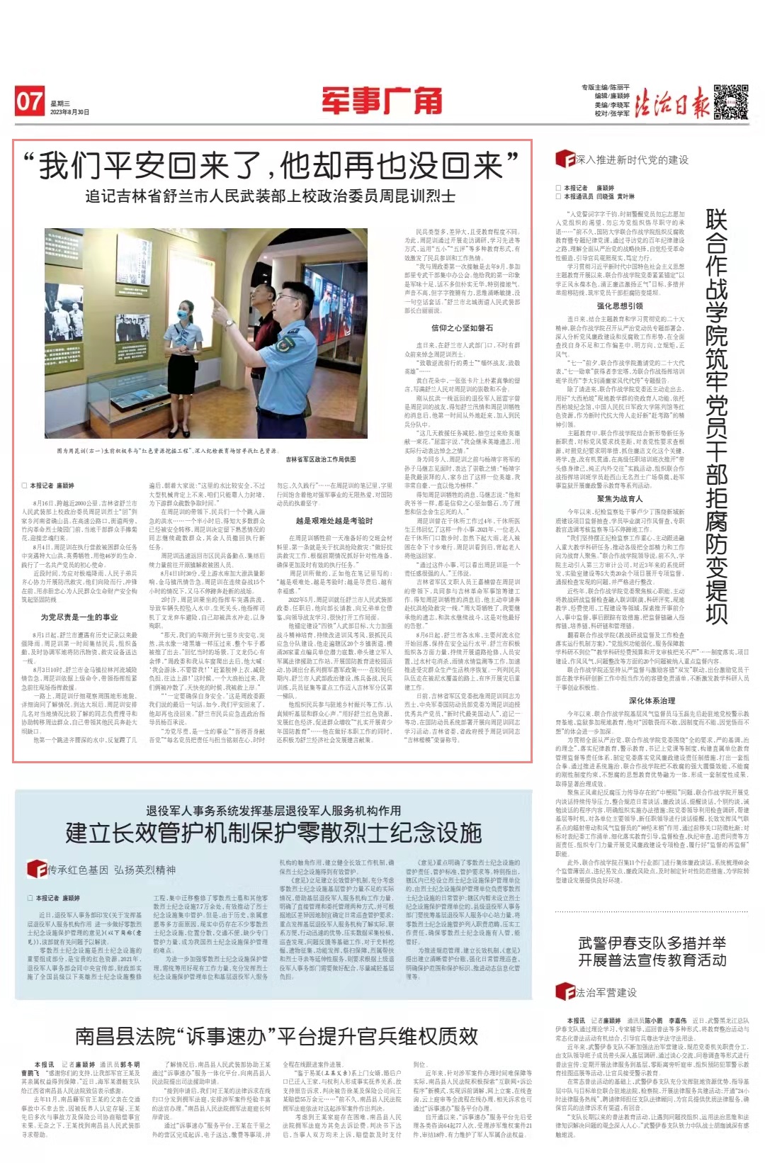 吉林省軍區(qū)文職人員王嘉楠曾在周昆訓(xùn)的帶領(lǐng)下,共同參與吉林革命軍事館籌建工作。得知周昆訓(xùn)犧牲的消息后,他主動(dòng)申請(qǐng)奔赴抗洪搶險(xiǎn)救災(zāi)一線(xiàn)。“周大哥犧牲了,我要繼承他的遺志,和洪水繼續(xù)戰(zhàn)斗,這是對(duì)他最好的告慰。”