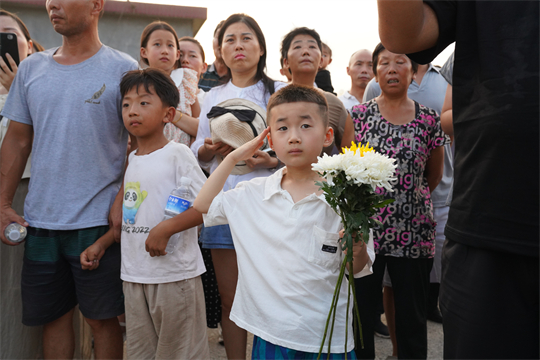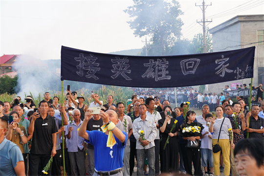8月16日,跨越近2000公里,吉林省舒蘭市人民武裝部上校政治委員周昆訓(xùn)烈士“回”到家鄉(xiāng)河南省確山縣。在高速公路口、街道兩旁、竹溝革命烈士陵園門(mén)前,當(dāng)?shù)馗刹咳罕娛峙蹙栈?,迎接忠魂歸來(lái)。