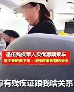 經(jīng)初步調(diào)查,9月1日上午,退伍殘疾軍人陳先生乘坐蒙F22637客運(yùn)班車,從內(nèi)蒙古自治區(qū)興安盟烏蘭浩特市去往吉林省白城市期間,該車乘務(wù)員何某某對(duì)陳先生所持的“中華人民共和國(guó)殘疾軍人證”不認(rèn)可,要求陳先生補(bǔ)票,并發(fā)表不正當(dāng)言論,造成惡劣影響。陳先生現(xiàn)場(chǎng)撥打12328熱線投訴,事后將現(xiàn)場(chǎng)視頻上傳某視頻平臺(tái)發(fā)布。