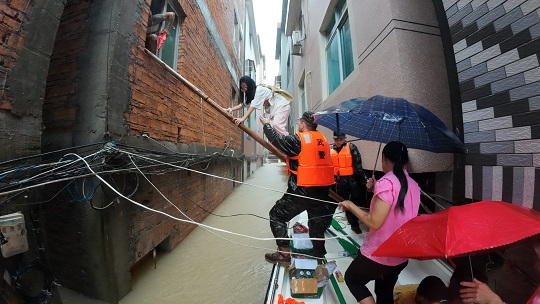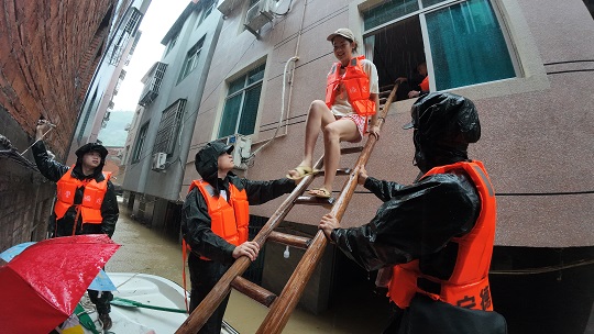 武警福建總隊寧德支隊接到命令后,立即啟動應(yīng)急處置預(yù)案,派出60余名官兵攜帶6臺沖鋒舟、2艘皮劃艇和救生衣等各類搶險裝備、救援器材趕赴受災(zāi)地域。針對受災(zāi)地域雨勢較大、漂浮物較多、救援現(xiàn)場街道狹小的情況,武警官兵駕駛沖鋒舟,使用梯子轉(zhuǎn)移高樓層群眾。官兵們在沖鋒舟上通力合作,一組人員扶梯子轉(zhuǎn)移群眾,另一組人員使用工具固定漂浮的船只,將群眾安全轉(zhuǎn)移到?jīng)_鋒舟上。結(jié)合水位仍在上漲的實際,官兵還給留守村民送去食物和飲用水。