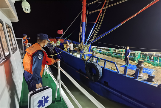 接警后,上海海警局立即調(diào)派距離最近的奉賢海警局執(zhí)法艇前往事發(fā)海域救援。23時30分,海警執(zhí)法艇克服能見度不良、海面漁船漁網(wǎng)多等不利因素,在佘山島以東海域發(fā)現(xiàn)漁船并轉(zhuǎn)移傷員,隨船衛(wèi)生員根據(jù)其受傷情況采取傷口消毒、包扎固定等先期救助措施。同時,崇明海警局協(xié)調(diào)120急救部門,派出專業(yè)力量到橫沙漁港碼頭待命。
