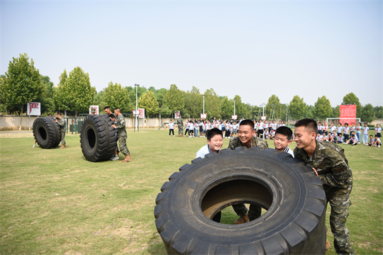 圖為在武警合肥支隊執(zhí)勤某大隊營區(qū),小學(xué)生與戰(zhàn)士們組隊進(jìn)行翻輪胎比賽。