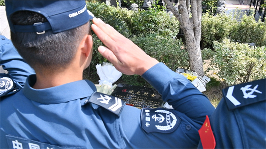 圖為海警執(zhí)法員在阜陽太和縣烈士紀念館。