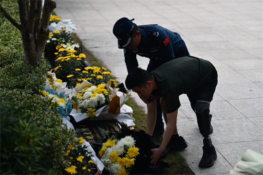 海警執(zhí)法員們一邊清理著汪曉龍烈士墓碑旁的雜草,一邊擦拭著墓碑?!鞍肽甓嗔?,我們都非常想念你,你看,圣森和泳熙也來了。這次,我們執(zhí)法小組全員都到齊。”爾后,大家列隊走到汪曉龍烈士墓碑前,依次敬獻鮮花,面對烈士墓碑沉痛哀悼。
