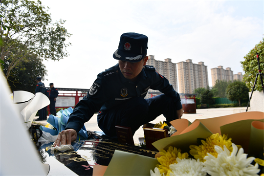 隨后,海警執(zhí)法員趕赴太和縣萬壽山烈士紀念碑廣場,汪曉龍烈士的墓碑安放在這里。