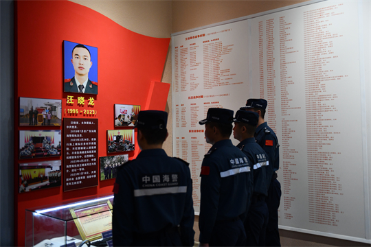 “這位是汪曉龍烈士,是我們阜陽太和人,生前是廣東海警局執(zhí)法員?!痹谔涂h烈士紀念館里,講解員講述著汪曉龍生前的先進事跡,在場人員聆聽著英烈事跡,看著館里展陳的汪曉龍烈士生前的遺物和工作照片,往事一幕幕浮現在廣東海警執(zhí)法員腦海中。