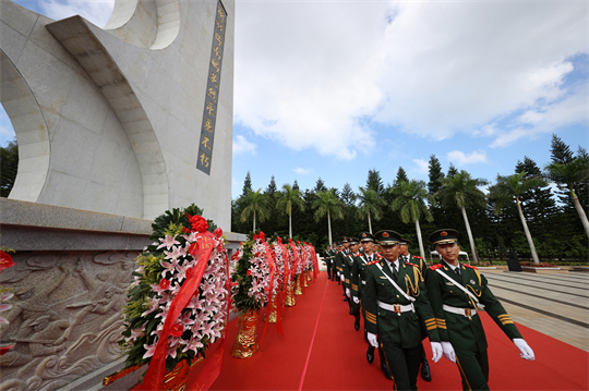 圖為武警海南總隊(duì)官兵在解放海南島戰(zhàn)役烈士陵園祭奠革命烈士時(shí)向革命烈士敬獻(xiàn)鮮花。