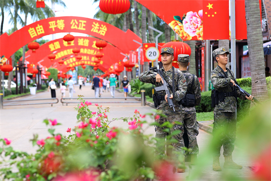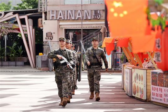 圖為擔(dān)負(fù)巡邏任務(wù)的武警海南總隊(duì)官兵在??谏习畎賲R城巡邏執(zhí)勤。