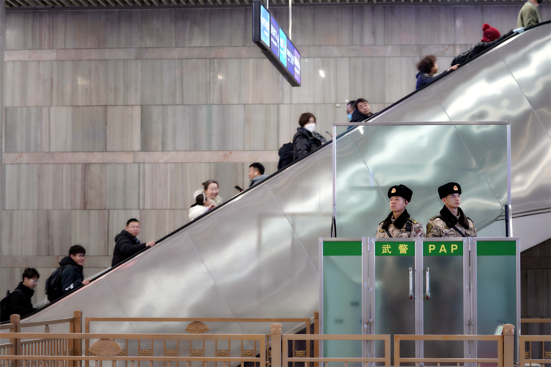圖為執(zhí)勤武警守護著行色匆匆的旅客。