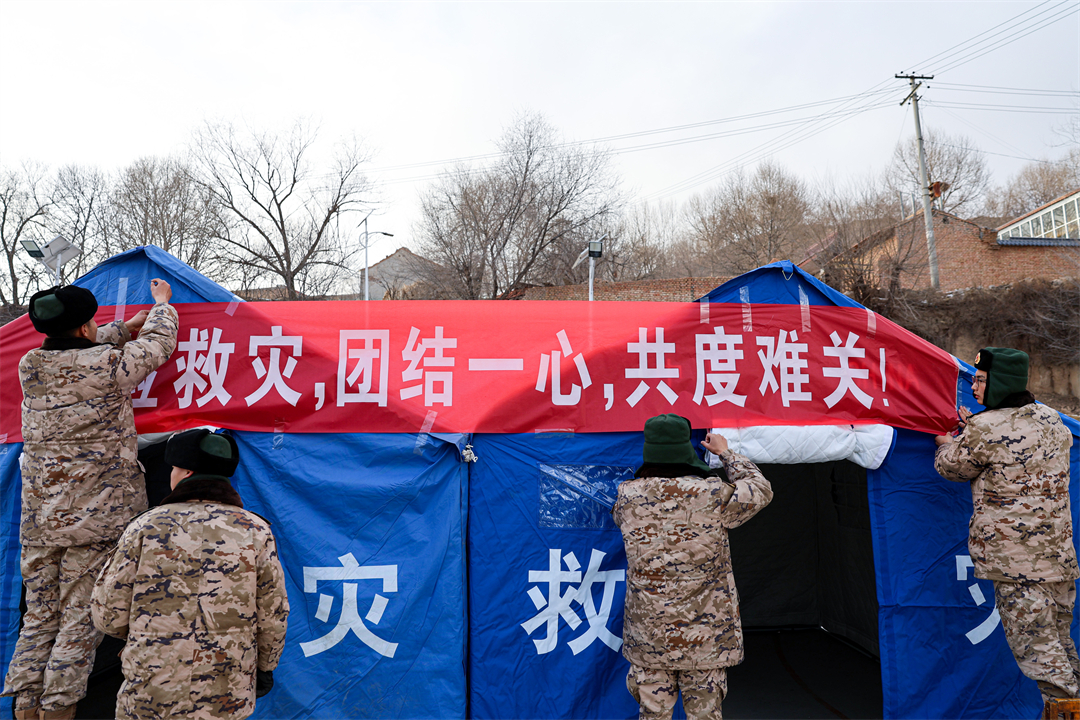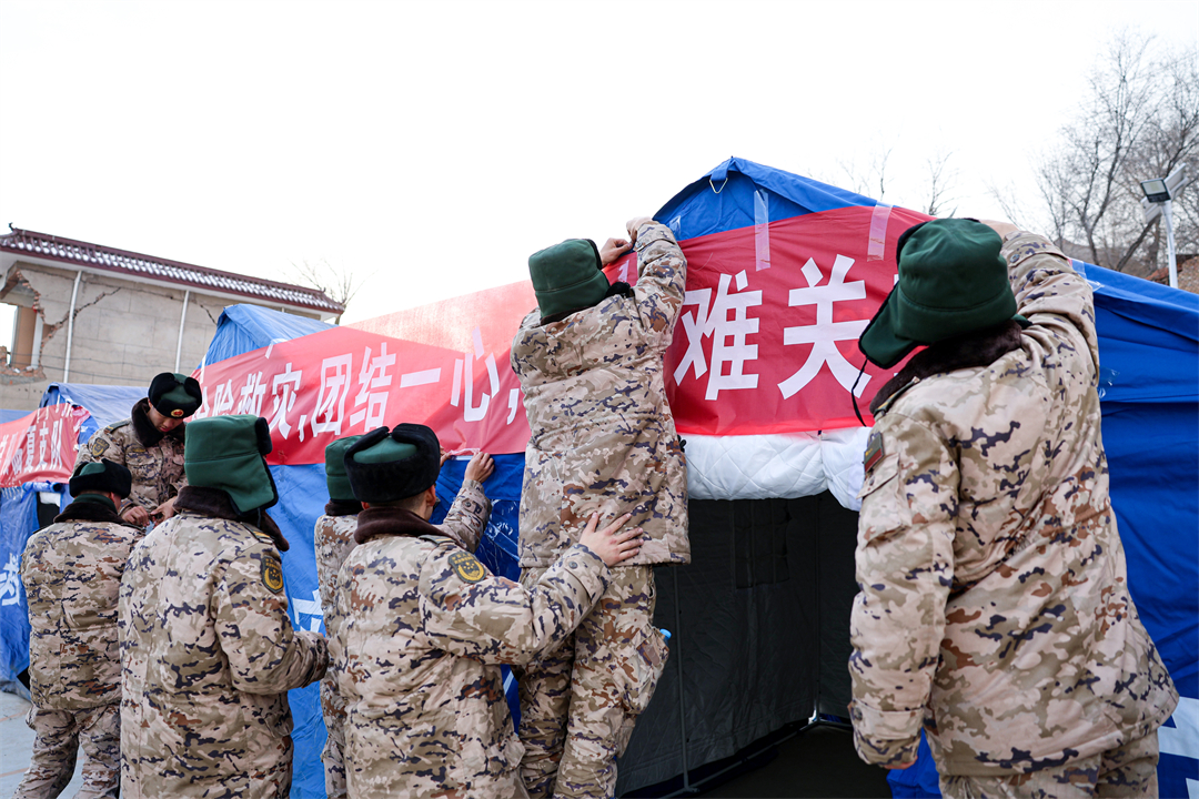 圖為12月19日,武警甘肅總隊(duì)臨夏支隊(duì)官兵正在搭建帳篷,張貼橫幅。