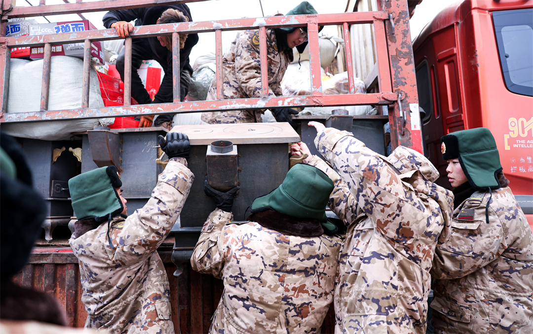 圖為12月19日,武警甘肅總隊(duì)臨夏支隊(duì)官兵正在搬運(yùn)取暖爐。