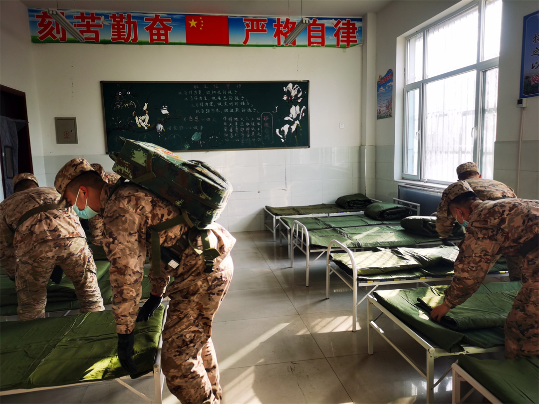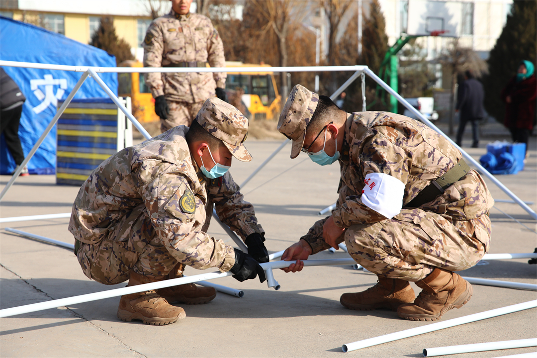 圖為武警青??傟?duì)任務(wù)官兵正布置臨時(shí)安置點(diǎn)。