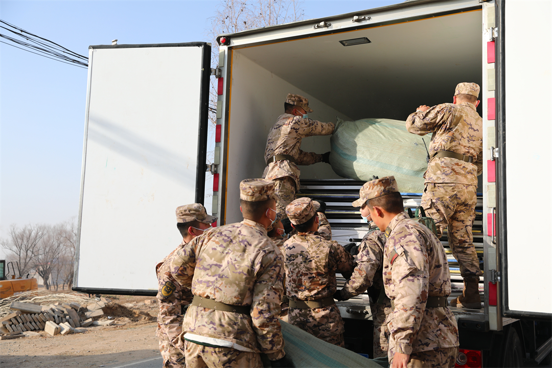圖為武警青海總隊(duì)任務(wù)官兵正搬運(yùn)物資并裝車(chē)。