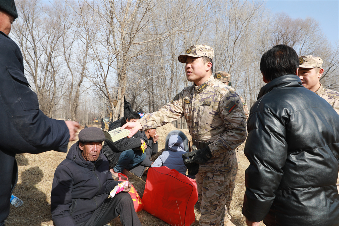 圖為武警青海總隊(duì)任務(wù)官兵為群眾分發(fā)自熱食品。
