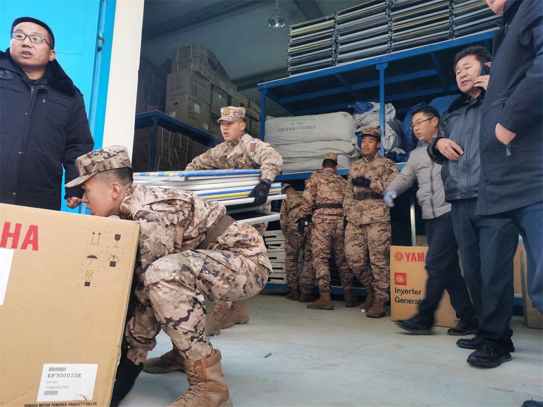 圖為武警青??傟?duì)任務(wù)官兵正卸下救援物資。