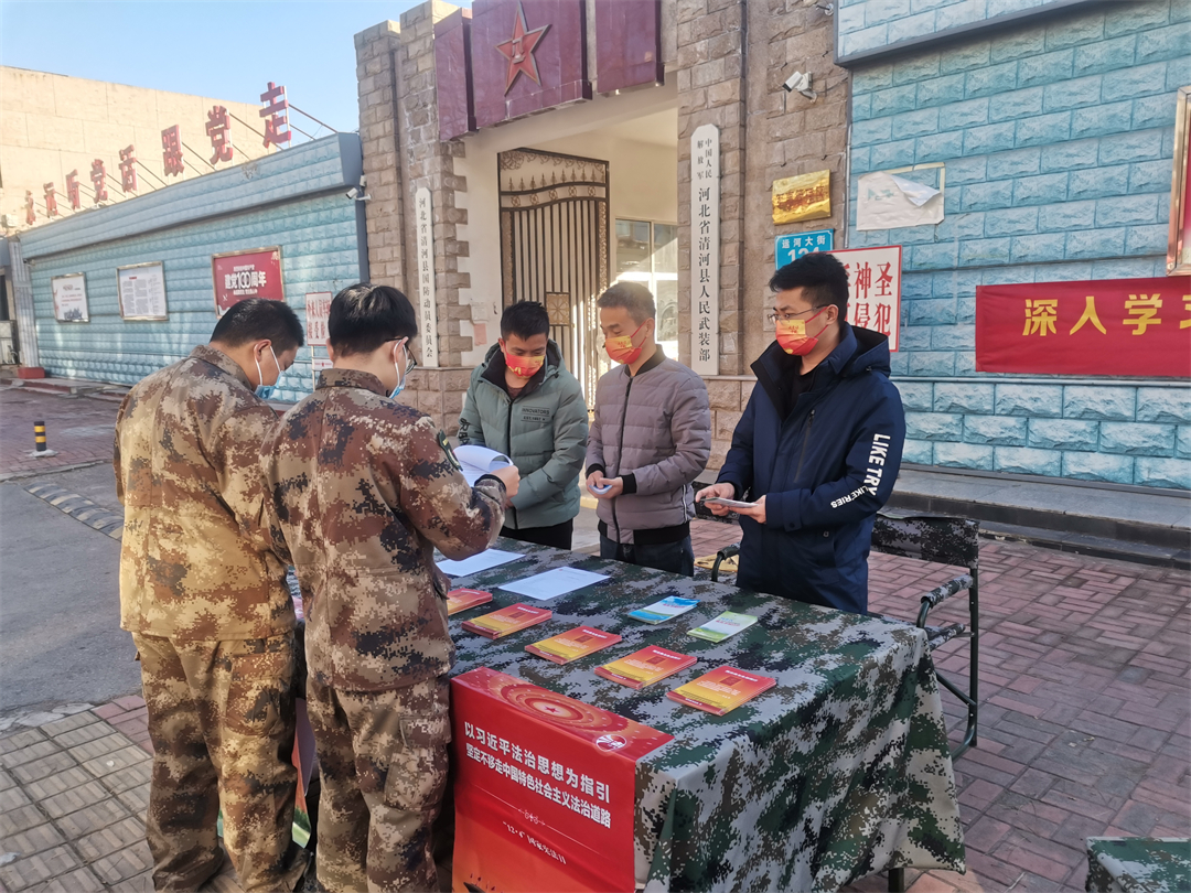 圖為河北省清河縣人武部聯(lián)合駐地法院、檢察院、退役軍人事務局向全體官兵和社會民眾進行普法宣傳。耿月磊 攝