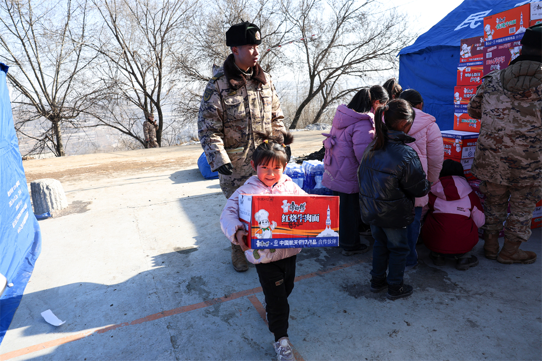 圖為12月21日,在甘肅省臨夏州積石山縣劉集鄉(xiāng)陽(yáng)屲村安置點(diǎn),一名小朋友和武警甘肅總隊(duì)臨夏支隊(duì)官兵一起搬運(yùn)救災(zāi)物資。