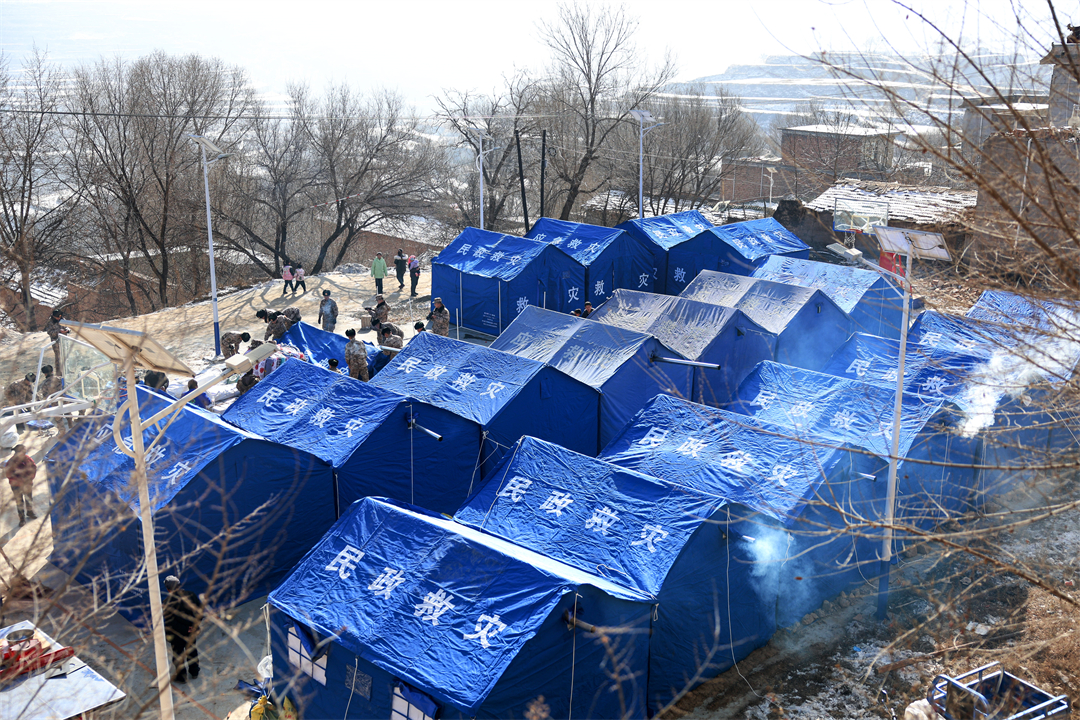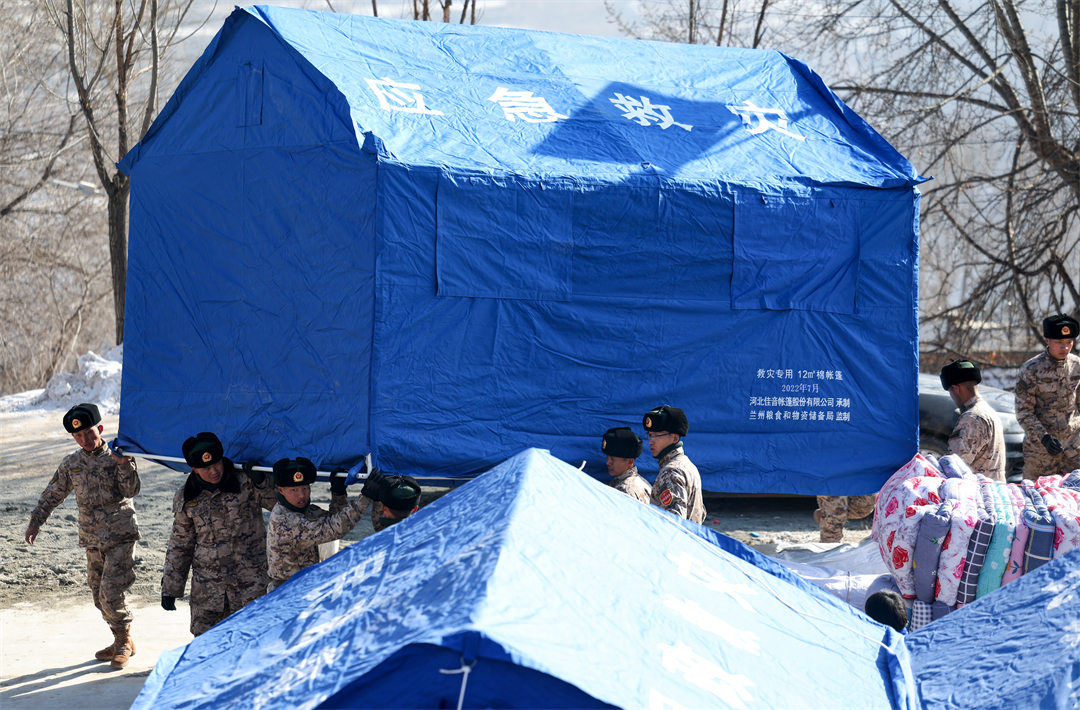 圖為12月21日,武警甘肅總隊(duì)臨夏支隊(duì)官兵在積石山縣劉集鄉(xiāng)陽(yáng)屲村搭建的帳篷。