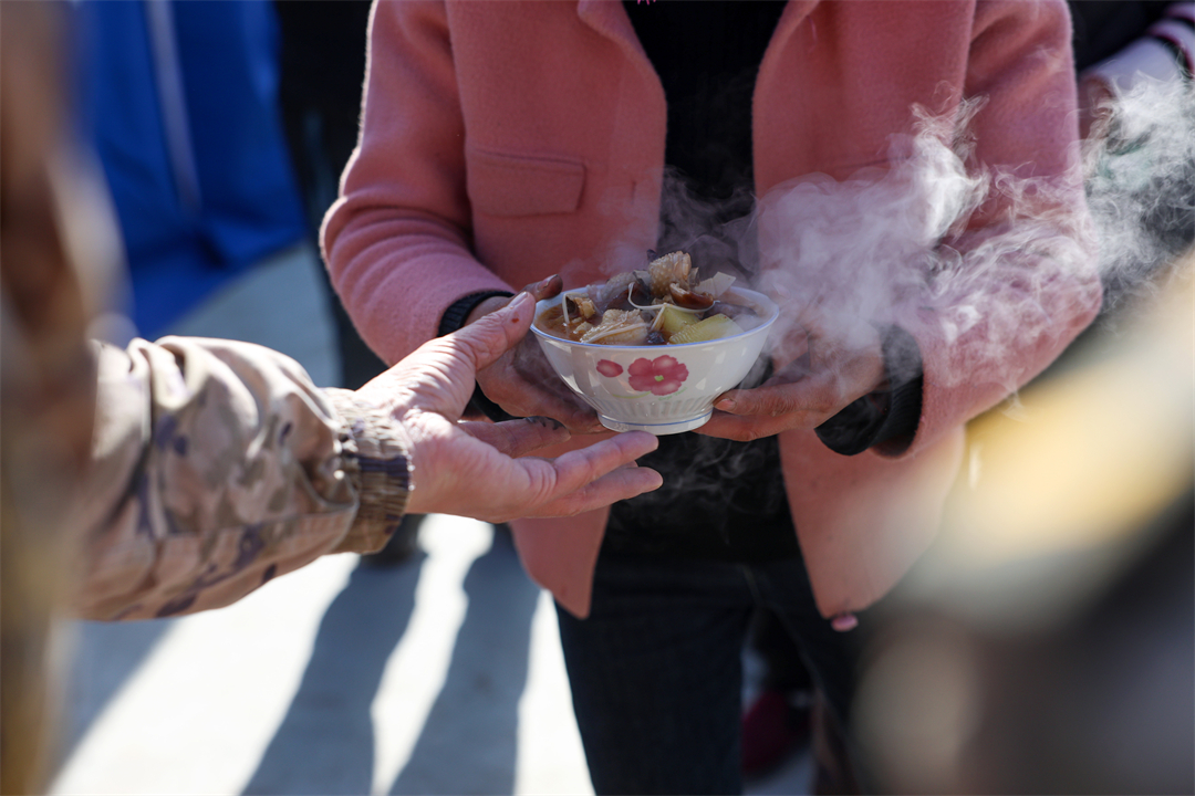圖為12月21日,武警甘肅總隊(duì)臨夏支隊(duì)官兵在積石山縣劉集鄉(xiāng)陽(yáng)屲村為受災(zāi)群眾供應(yīng)熱食。